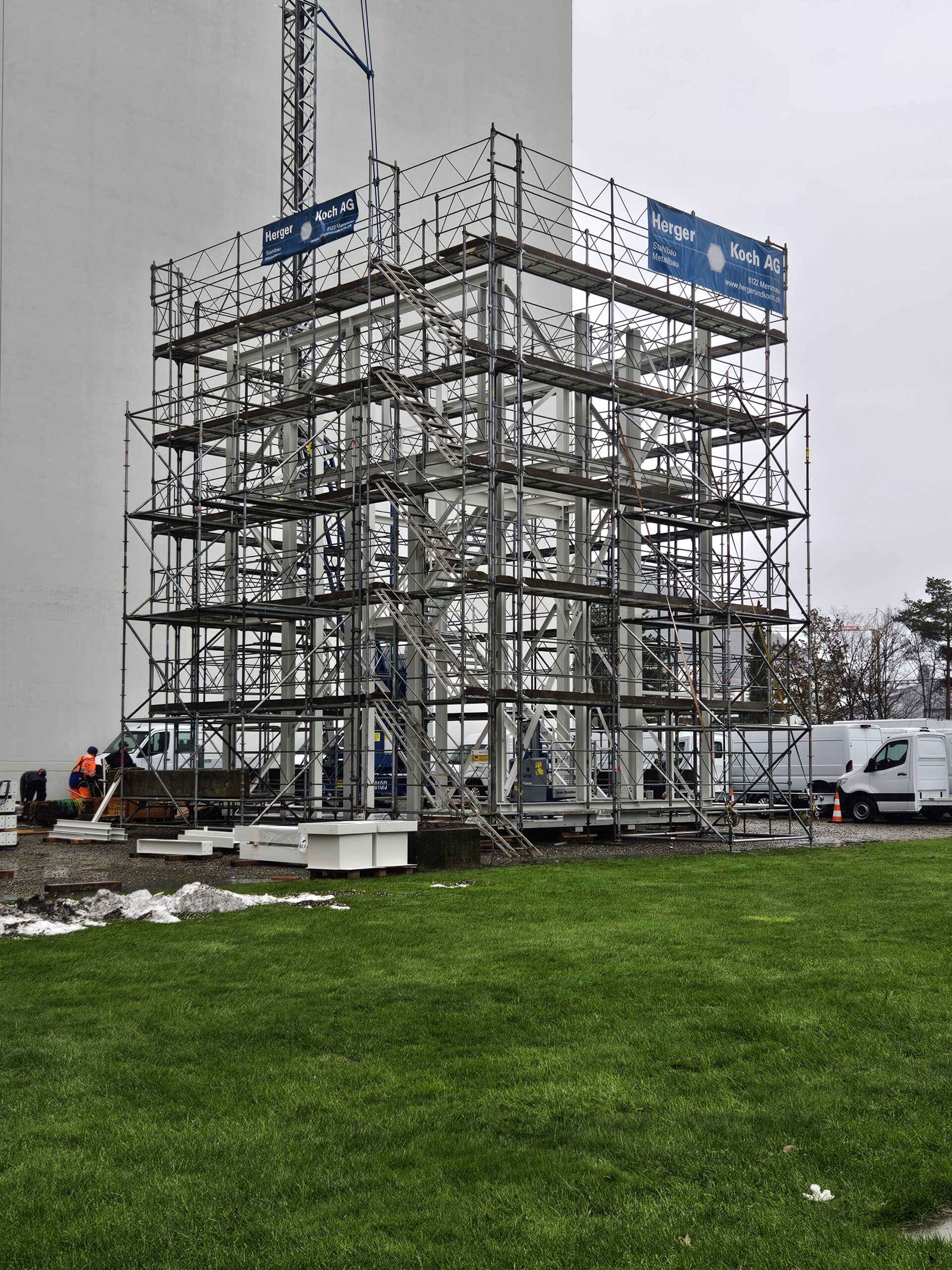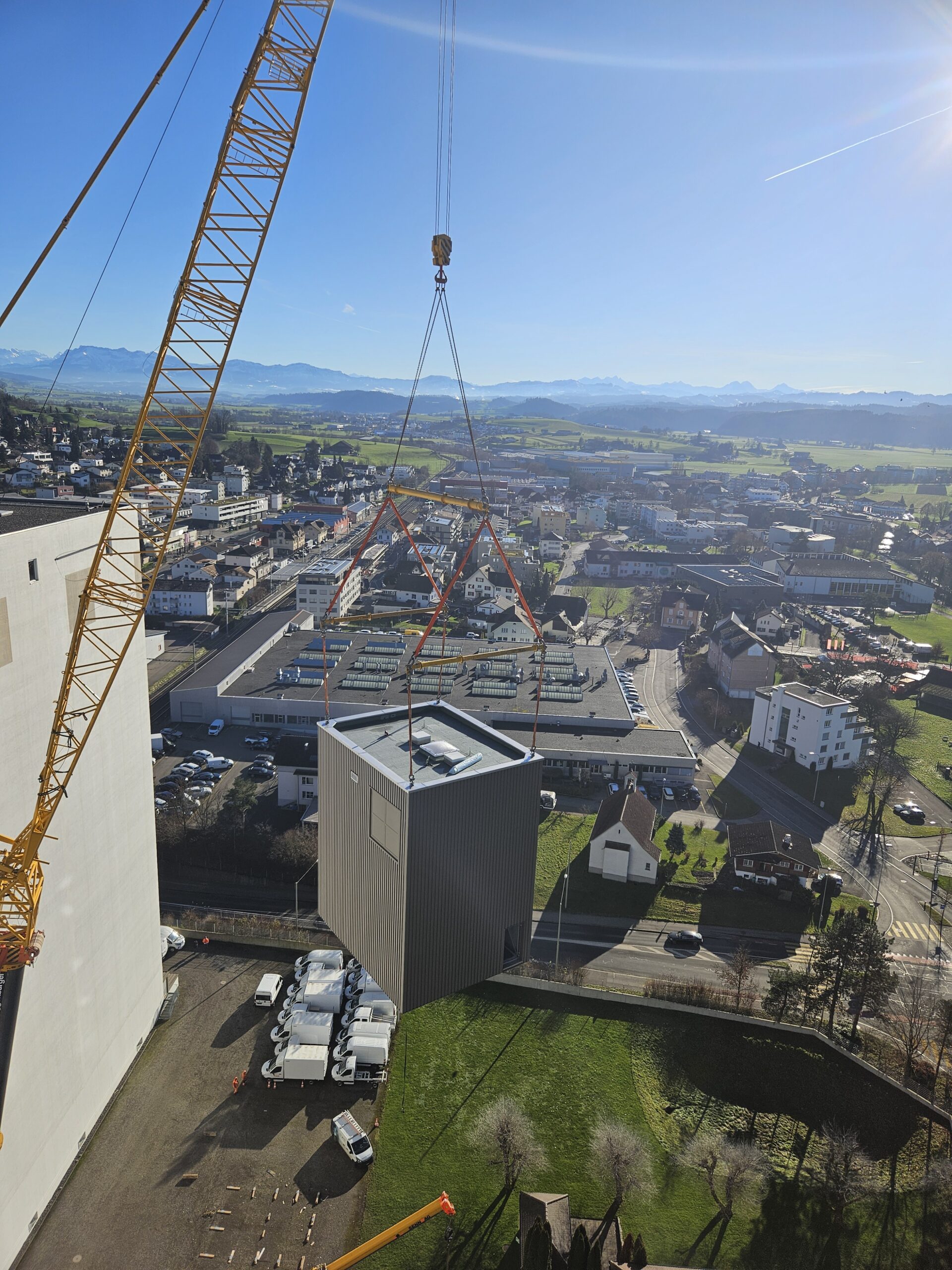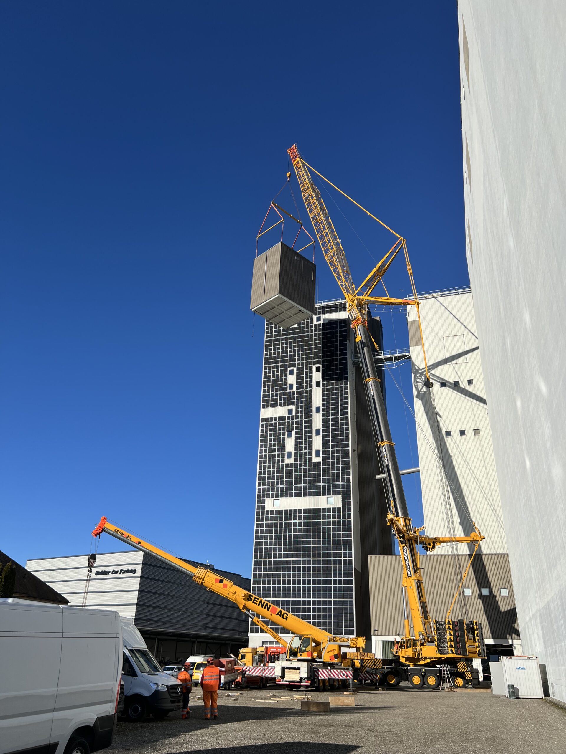 Der Turm, welcher eine Abmessung von 7.2m x 8.9m hat und 11m hoch ist, wurde vorgängig am Boden zusammengestellt. Anschliessend wurde der 40t schwere Turm mit einem Kran auf das 60m Hohe Silo befördert.