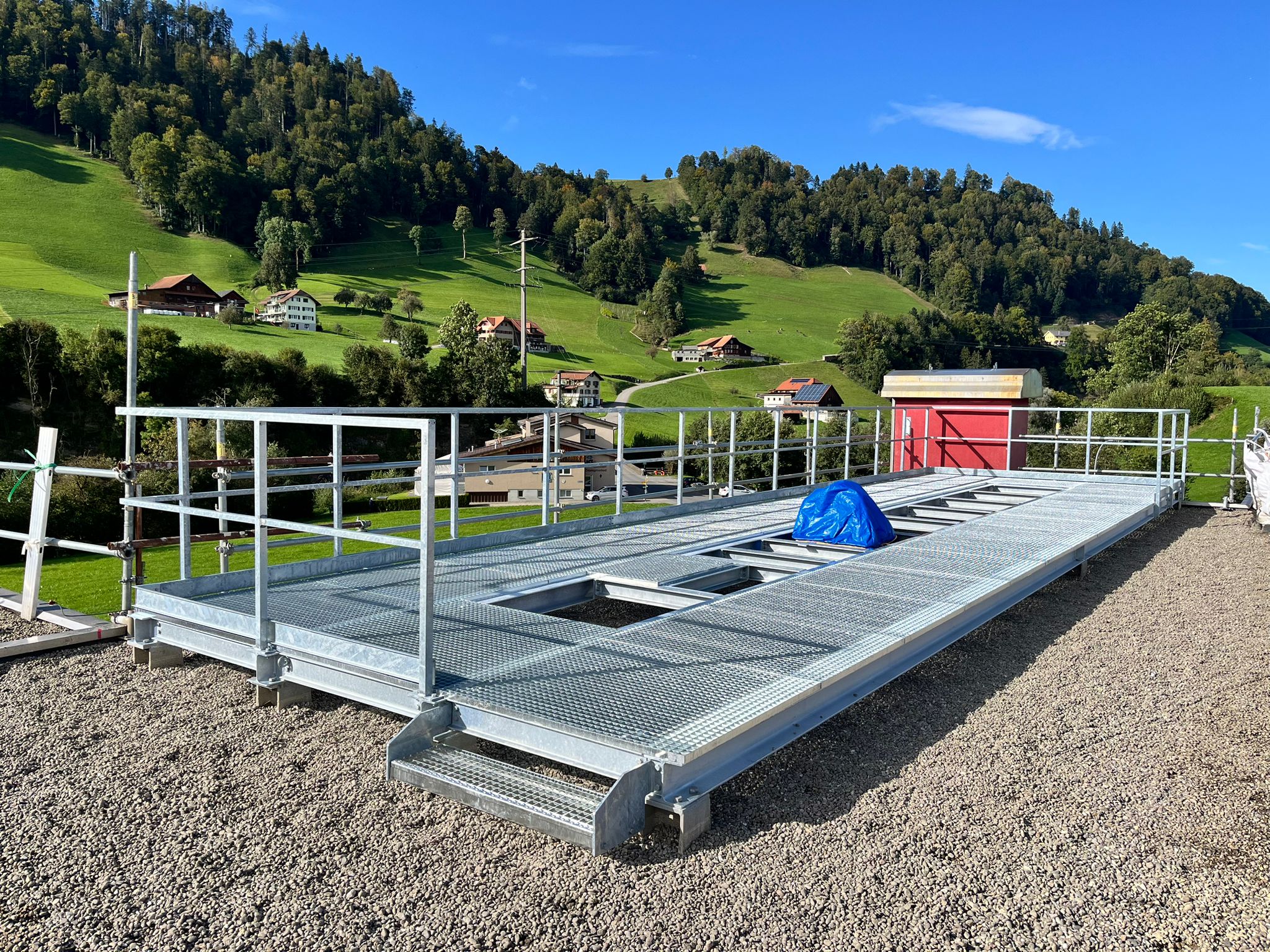 Für die neue Photovoltaikanlage der Firma Müller Martini AG in Hasle, durften wir die Unterkonstruktion für die Wechselrichter auf dem Dach montieren. Rundum erstellten wir einen Laufsteg aus feuerverzinkten Gitterrosten, dieser wurde mit einem Geländer aus Vierkantrohren als Absturzsicherung versehen. Abgestellt wurde das Podest auf wärmegedämmten Konsolen, welche auf der bestehenden Stahlkonstruktion aufliegen.
