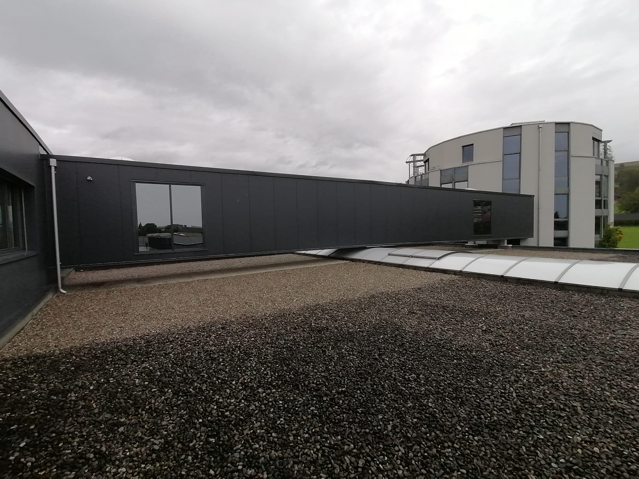 Das Dach und die Fassade wurden aus Sandwichpaneelen gefertigt. Für ausreichend Helligkeit wurden Fensterfronten aus Sonnenschutzglas sowie Dachoberlichter eingebaut.